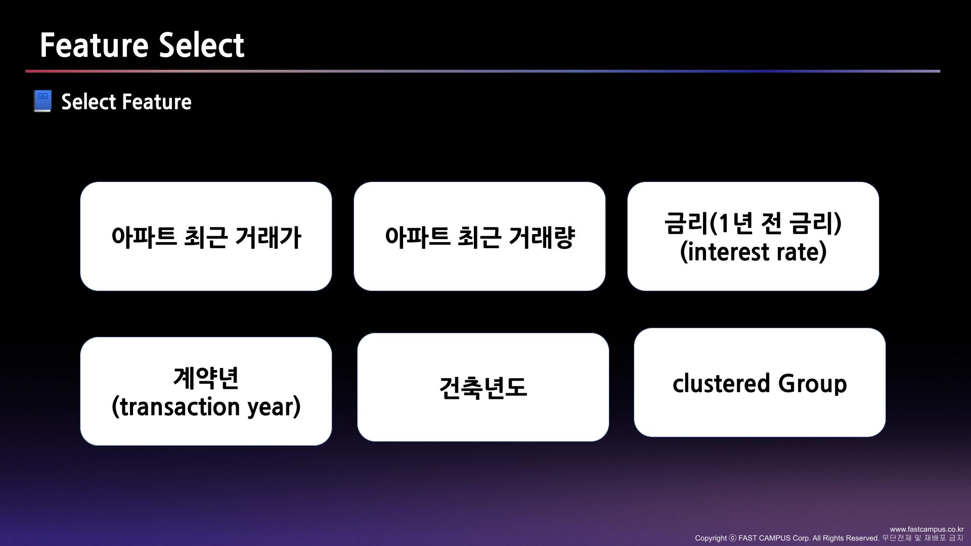 금융 관련 요인 : 금리, GDP, 전세가율 거리 요인 : 역세권, 한강 조망권, 숲이나 도시 공원 같은 자연 조경과 관련된 시설물 교육 요인 : 학군, 학급 개수 제재 요인 : 부동산 제도 변화 아파트 구성 요인 : 방 개수, 화장실 개수, 주차장 면적, 세대수, 세대당 주차장 개수