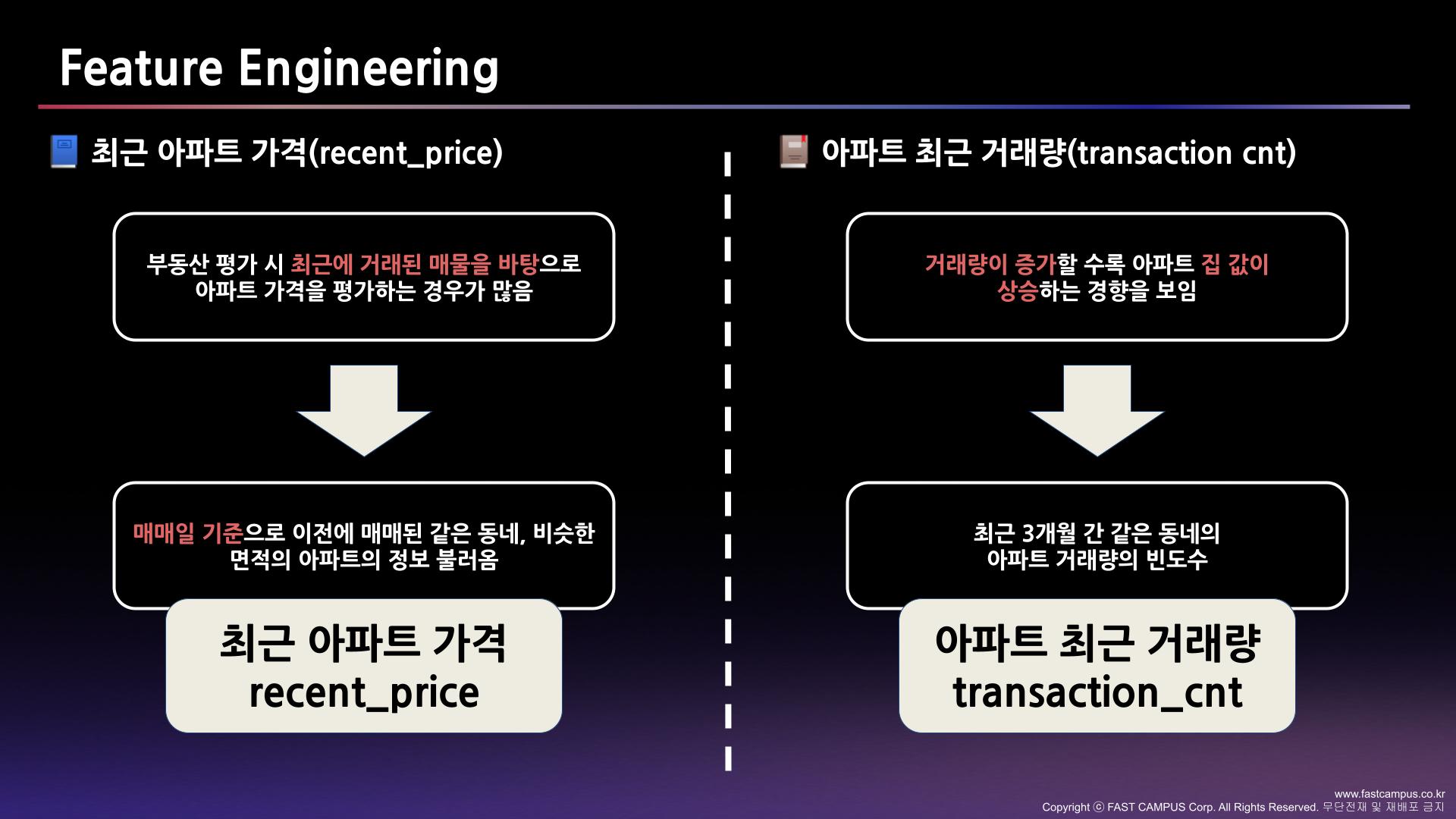 EDA는 주로 'target' column을 중심으로 진행하였고 해당 과정을 통해서 'Dong_Rank' 동별 집값 평균가에 따른 순위를 나타낸 new feature, 'SPACEAPT_AVG' 동별 아파트의 전용면적 에 따른 평균가를 구해서 15000부터 1200000까지 총 78개로 카테고리를 나누어 표현한 new feature를 생성하였다.