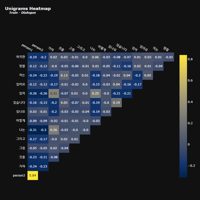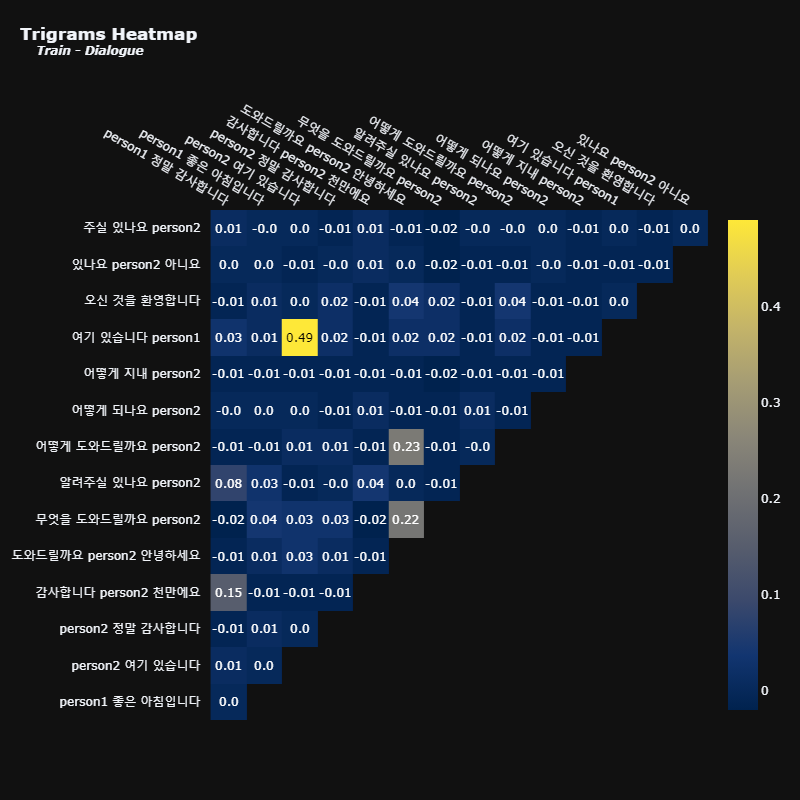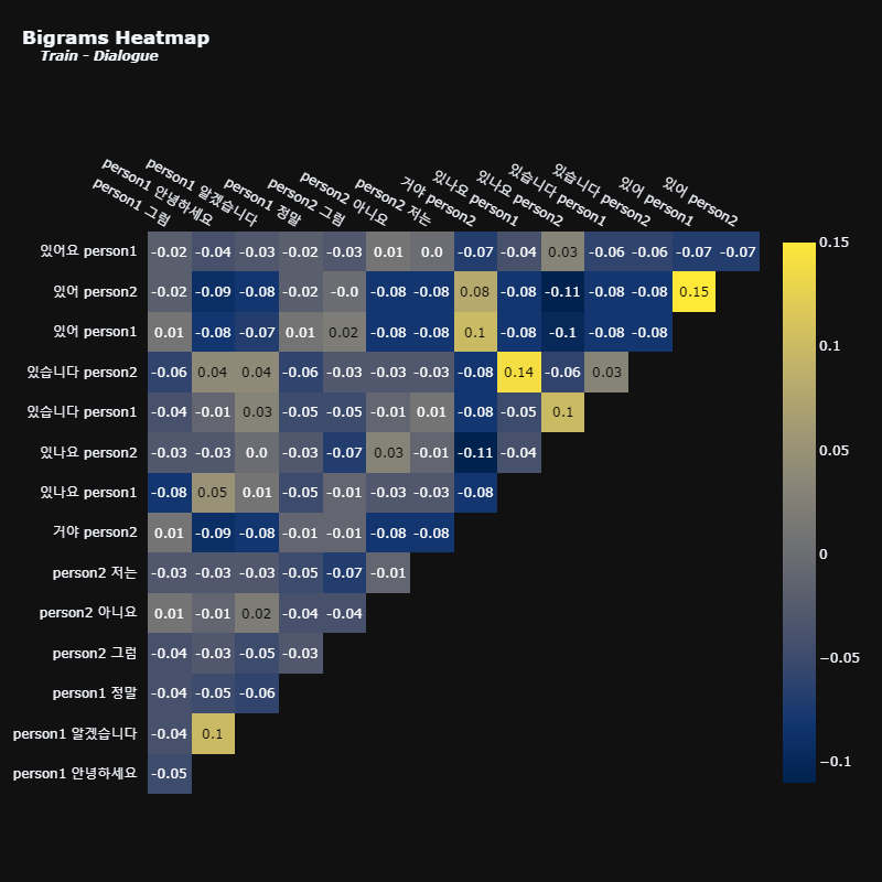 Train Dialogue의 Unigram과 Bigram, Trigram 상위 14개의 Heatmap을 표현