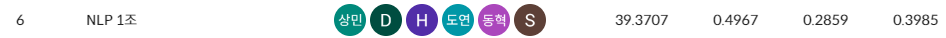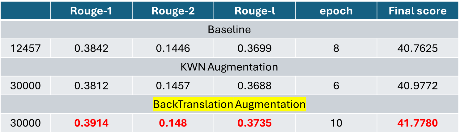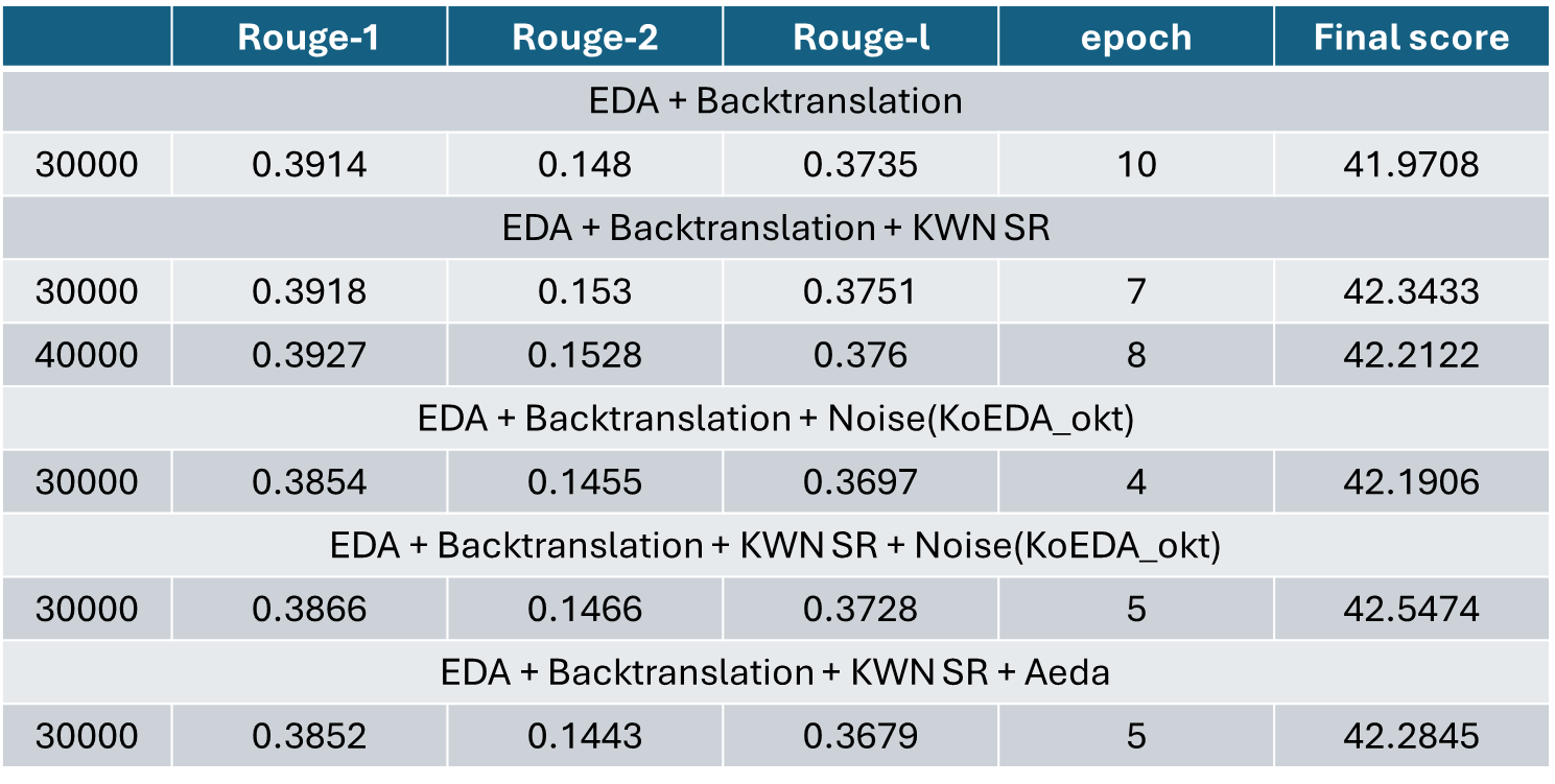 Mix : Backtranslation + KWN + KoEDA + AEDA + hyperparameter tuning 최종 Best score는 42.5474의 기법을 활용한 것이었다. LLM Model의 훈련 데이터에 Noise를 주면 좋다는 reference가 많았다. 따라서 train data에 noise를 추가할 수 있는 기법들을 많이 검색하고 찾아서, 기존에 잘 학습된 방식에 augmentation 기법을 추가하는 방식으로 진행했다. 다행히 기존 41점대만 유지하다가, 42점을 최초로 돌파하며 LLM fine tuning에 자신감을 얻었다.