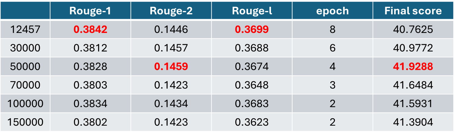 실험 : 몇 개의 데이터 개수가 훈련하기에 적합한가? (증강 기법 : 기존 데이터 + KWN 유의어 대체 데이터) 데이터 증강에 앞서서 몇 개의 데이터 개수가 적합한지 실험을 하고자 했다. 따라서 기존 12457개에서 데이터를 30000개 / 50000개 / 70000개 / 100000개 / 150000개로 증강하고 데이터 개수에 따른 모델마다 rouge-1 / rouge-2 / rouge-l 을 가장 조화롭게 좋게 보이고 있는 모델로 inference를 하여 final score를 비교하여 데이터 개수를 정하는 방법을 생각해보았다. 기존 data 및 증강된 데이터로 훈련시켜 나온 best score. score와 best score가 나온 epoch, 해당 모델로 inference를 하여 나온 Final score 실험 결과에 따라 데이터 증강의 가장 적절한 값은 50000~70000개 정도라고 생각하였다.