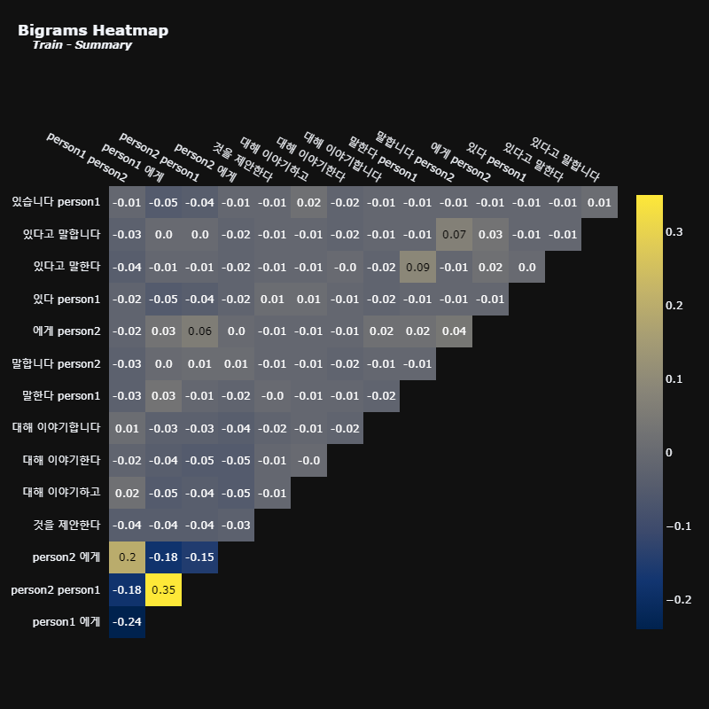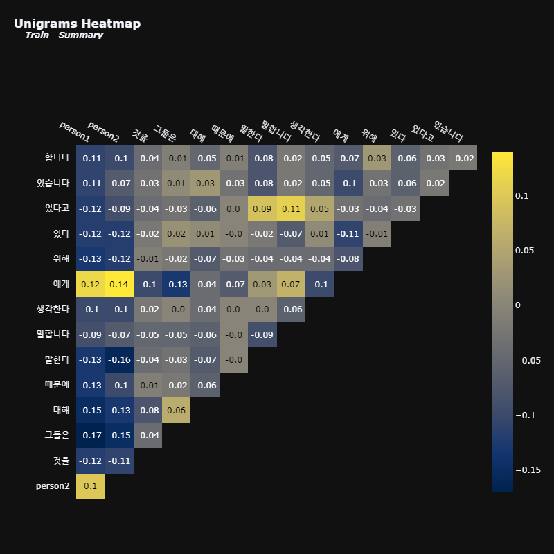 Train Summary의 Unigram과 Bigram, Trigram 상위 14개의 Heatmap을 표현 Evaluation Metric은 ROUGE이다. 모델 요약본과 참조 요약본 간에 겹치는 unigram과 bigram, n-gram의 수를 비교하며 스코어를 낸다. 이에 따라서 향후 Data preprocessing 시, 이와 같은 관점들을 적용시켜 모델의 성능 향상에 도움이 되지 않을까 싶어서 다음과 같은 Train Dialogue, Summary 의 n-gram Heatmap을 그려보았다.