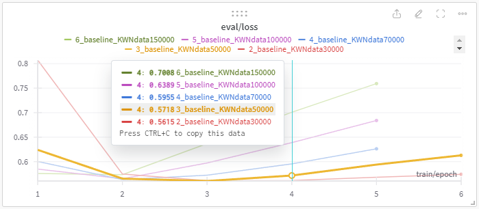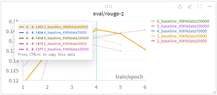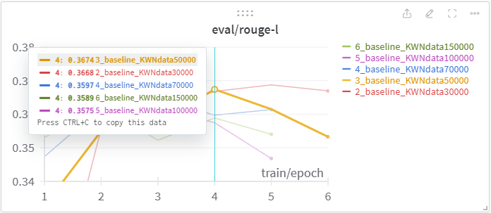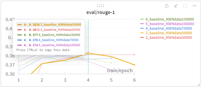 로스 값이 상승함에도 불구하고 50000~70000개를 훈련 데이터 셋의 증강 기준으로 정한이유 wandb에서 보여준 위 그래프를 확인해보시면, loss 최저값을 찍고 1epoch에서 모델들이 가장 좋은 rouge 값을 보여주고 모든 값이 하락합니다. loss 값이 오르더라도 이는 모델이 훈련 데이터에 과적합되지 않고, 검증 데이터에서 일반화되고 있는 경우이기에 로스 값이 증가하였다고 생각했습니다.