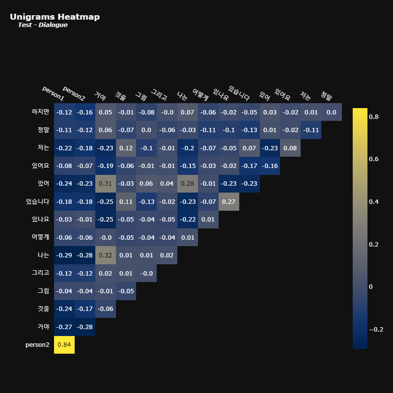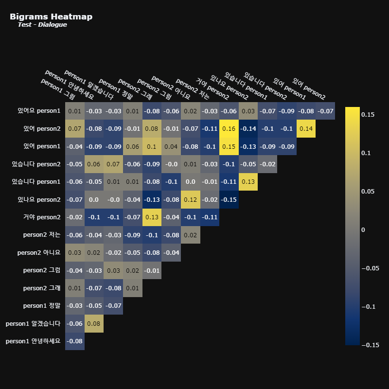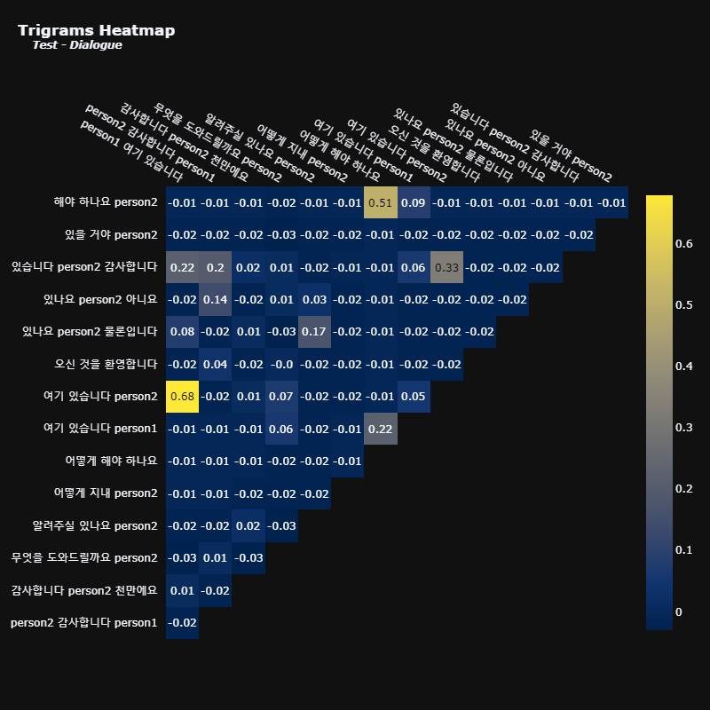 Test Dialogue의 Unigram과 Bigram, Trigram 상위 14개의 Heatmap을 표현