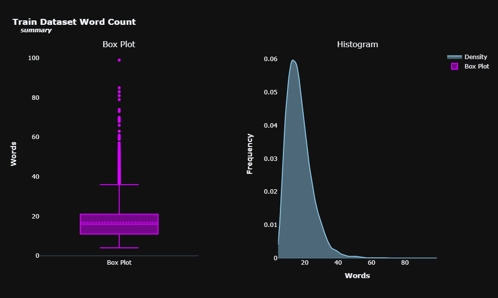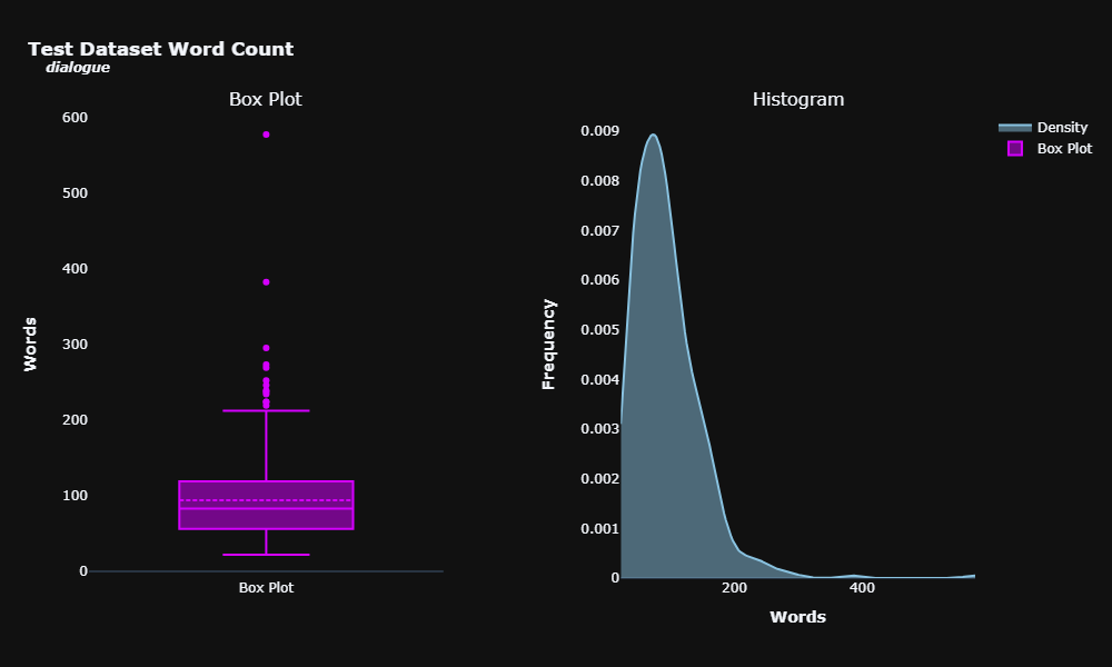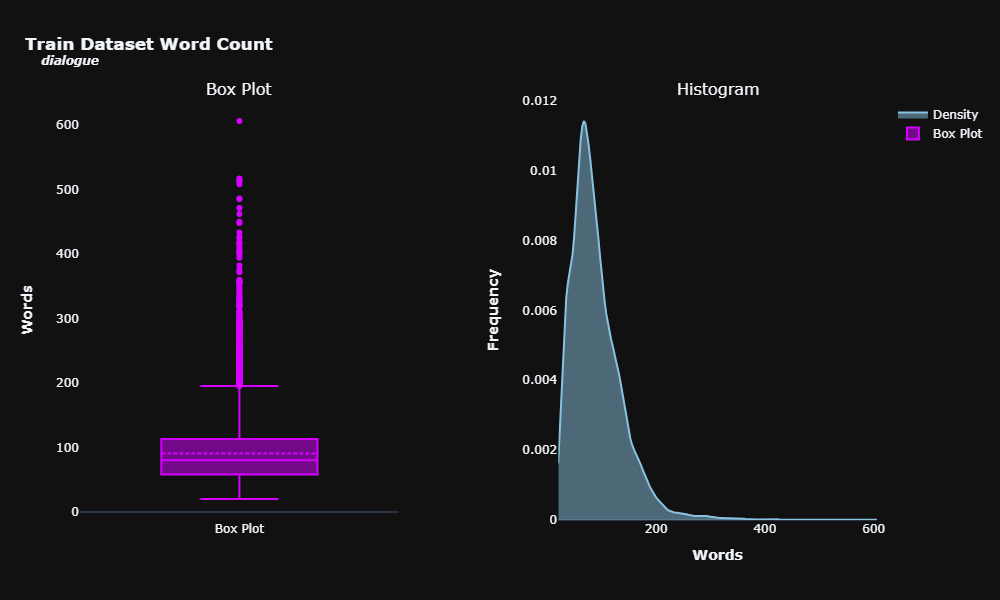 Train의 "Dialogue, Summary" feature의 글자수를 한 번 Box plot과 Histogram으로 표현해보았다. 우리는 Dialogue를 전달 받으면 Summary를 생성하는 모델을 제작 중이다. Train Summary의 Word Count 이상으로 Test의 Summary를 생성하게 되는 것이 의미가 없다고 생각해서 다음 EDA를 진행하였다.