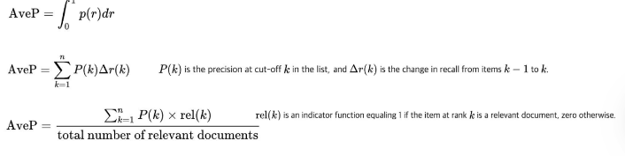 - Average Precision은 Precision-recall curve에서 아래쪽 면적인데 다음 수식으로 표현할 수 있음