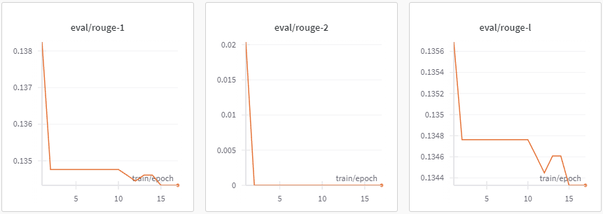 train epoch가 지날수록, eval loss는 떨어지는데 ROUGE score는 하락한다. 처음에 코드를 정확하게 파악하지 않고 Kobart보다 더 큰 모델인 T5에게 훈련시키는 데이터가 적었기 때문에 underfitting이 난다고 판단을 했었다. 그래서 T5 모델을 사용해보지 못하고, Kobart를 fine tuning해서 대회를 마무리 했었다.