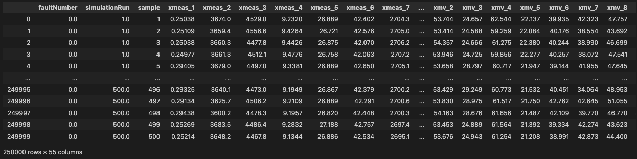- xmeas_* : measurement 의 약자로, 화학 공정에서 측정된 센서 값 입니다.